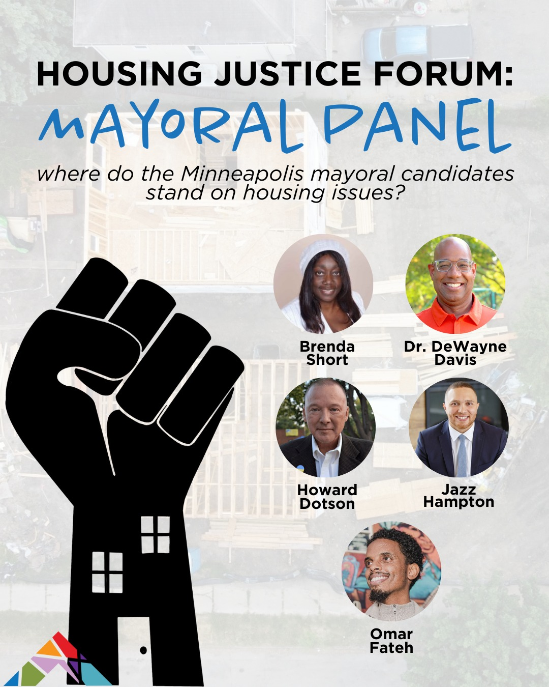 Join Housing in Action's Housing Justice Forum for a virtual mayoral panel to see where Minneapolis election candidates stand on housing issues before you vote.
